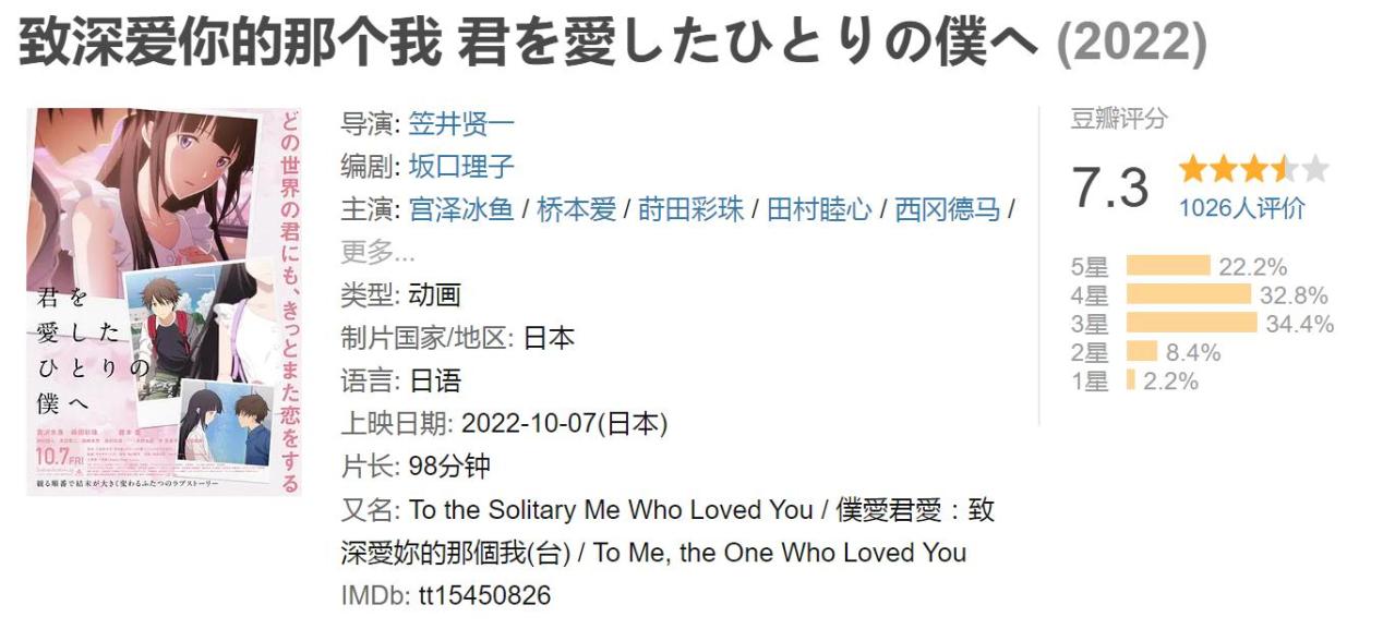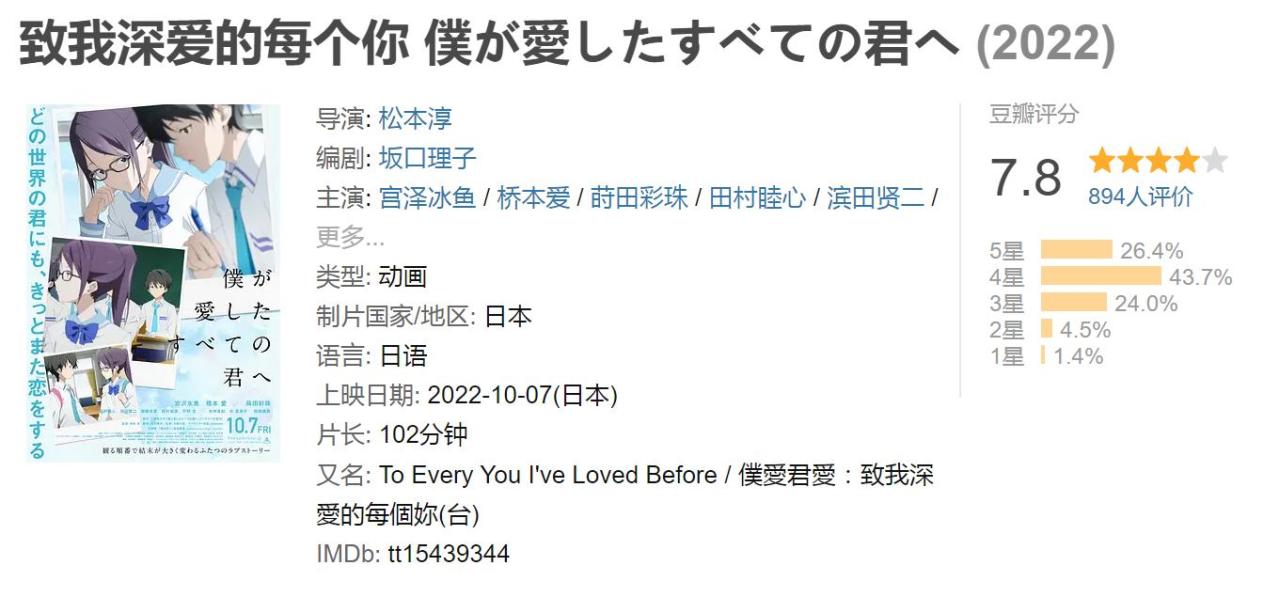 【动漫电影】致我深爱的每个你 & 致深爱你的那个我 (1080p.Blu-ray.REMUX.H264.8bit.DTSHD-MA )【17.4G & 17.4G/自建】 影视, 影音区 2年前 xetjzh - 2 简介……豆瓣截的将就看吧 ƪ (‾ ̄o ̄”)ʃ (已经懒的不想动了) 链接:致我深爱的每个你 链接:致深爱你的那个我